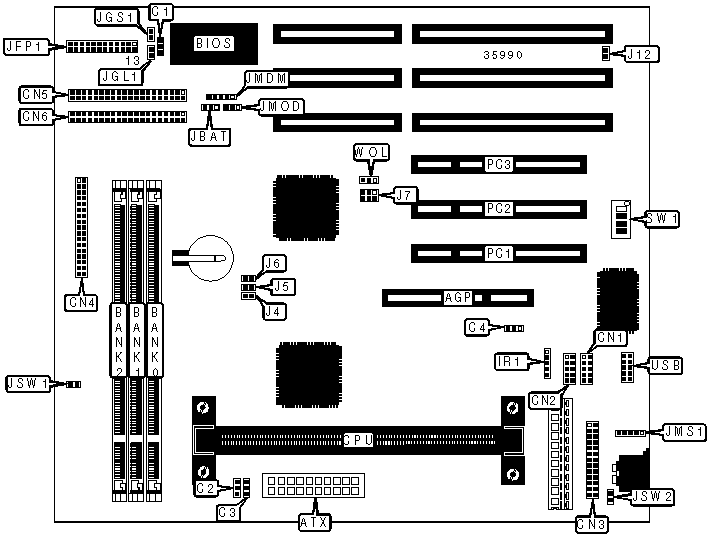 32-bit PCI slots (3), floppy drive interface, green PC connector, IDE interfaces (2), parallel port, PS/2 mouse port, serial ports (2), IR connector, USB connectors (2), ATX power connector, AGP slot, SB-link connector, wake on modem connector, wake on LAN connector